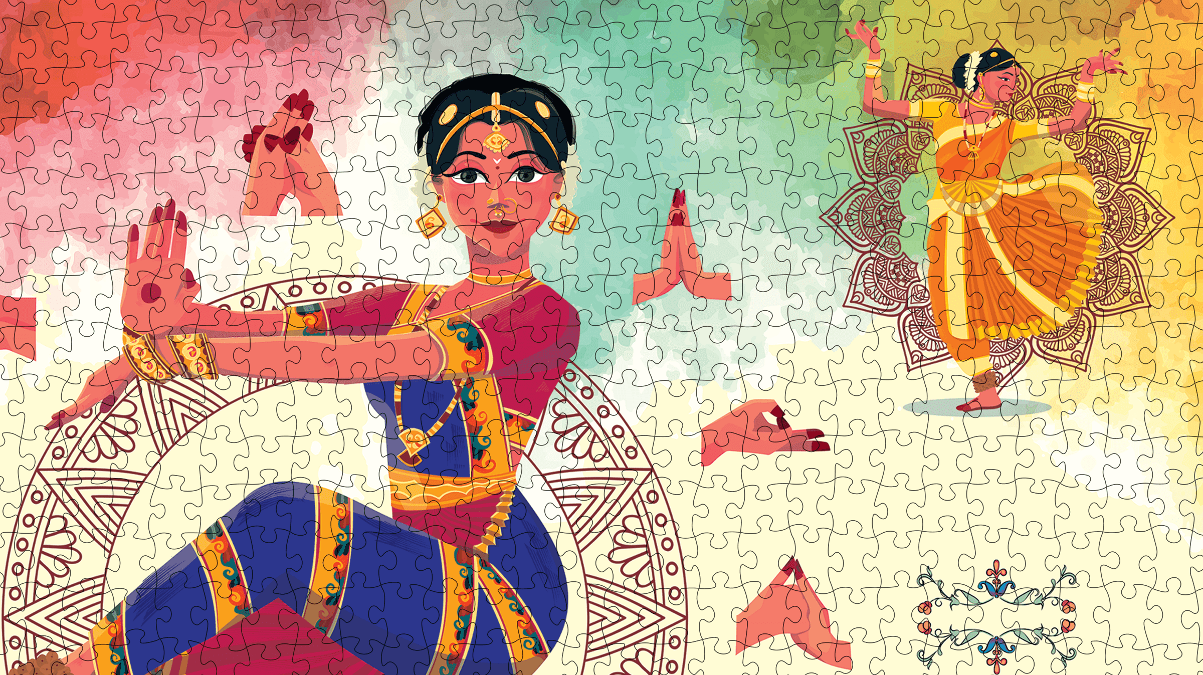 Challenge your mind and enhance your décor with this 1000-piece Indian-inspired puzzle. Once completed, it becomes a captivating artwork that brings warmth and culture to any room.